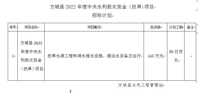 方城县2022年度中央水利救灾资金(抗旱)项目招标计划